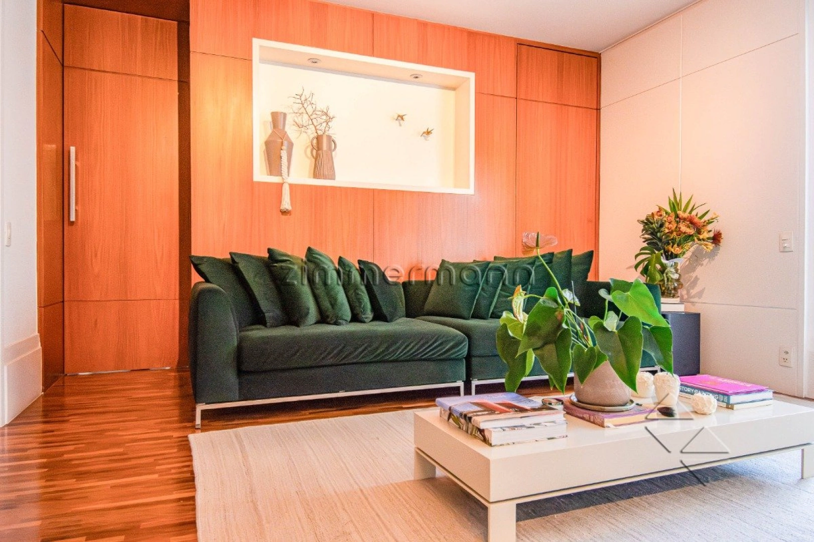 Possui acabamentos de alto padrão, piso de madeira nobre, armários planejados, lavabo decorado, janela antirruído na suíte e ar-condicionado quente e frio na sala e no quarto.
